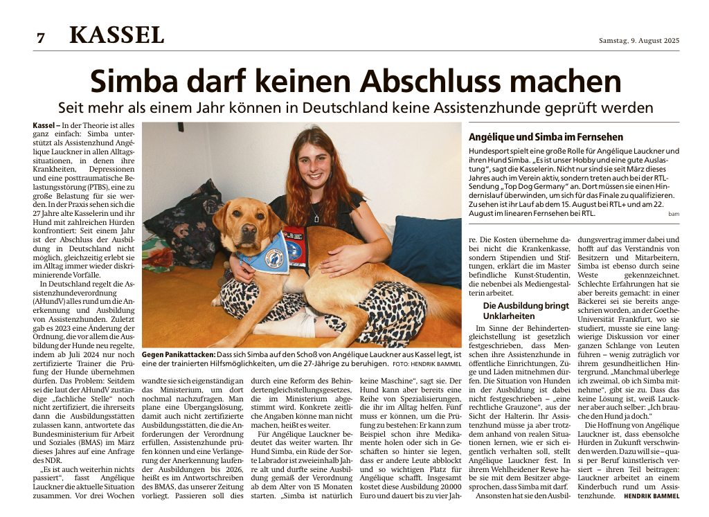 Die Kasseler Tageszeitung (Hessische/Niedersächsische Allgemeine) berichtet über die aktuellen Schwierigkeiten für fertig ausgebildete Assistenzhunde-Teams, die auf die Gesetzesänderung warten müssen, weil es derzeit keine Prüfungsmöglichkeit gibt. Hierzu hat die Zeitung mit Angélique gesprochen, die den Labrador-Rüden Simba zum PTBS-Assistenzhund ausbildet bei Assistenzhundetrainerin Petra Köhler.