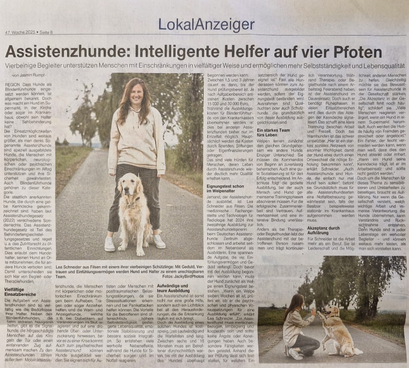 Assistenzhundetrainerin Lea Schneider wurde vom LokalAnzeiger zum Thema Assistenzhunde interviewt.