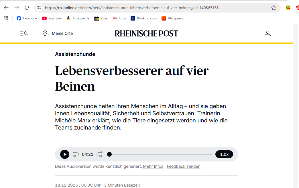 Die Rheinische Post berichtet über die beiden angehenden Assistenzhunde Rudi und Bruno, die bei Assistenzhundetrainerin Michele Marx ausgebildet werden.