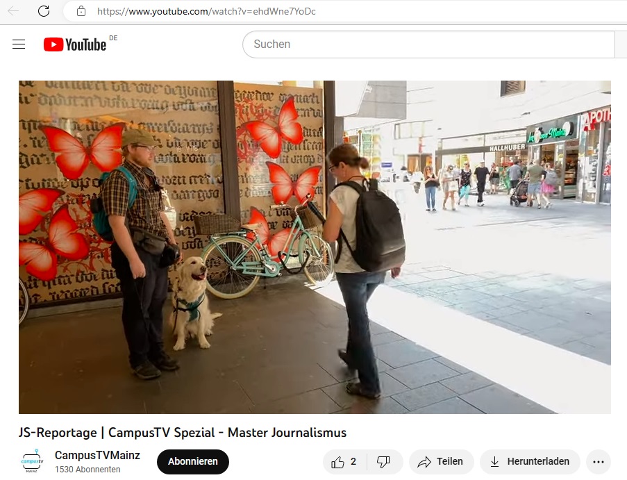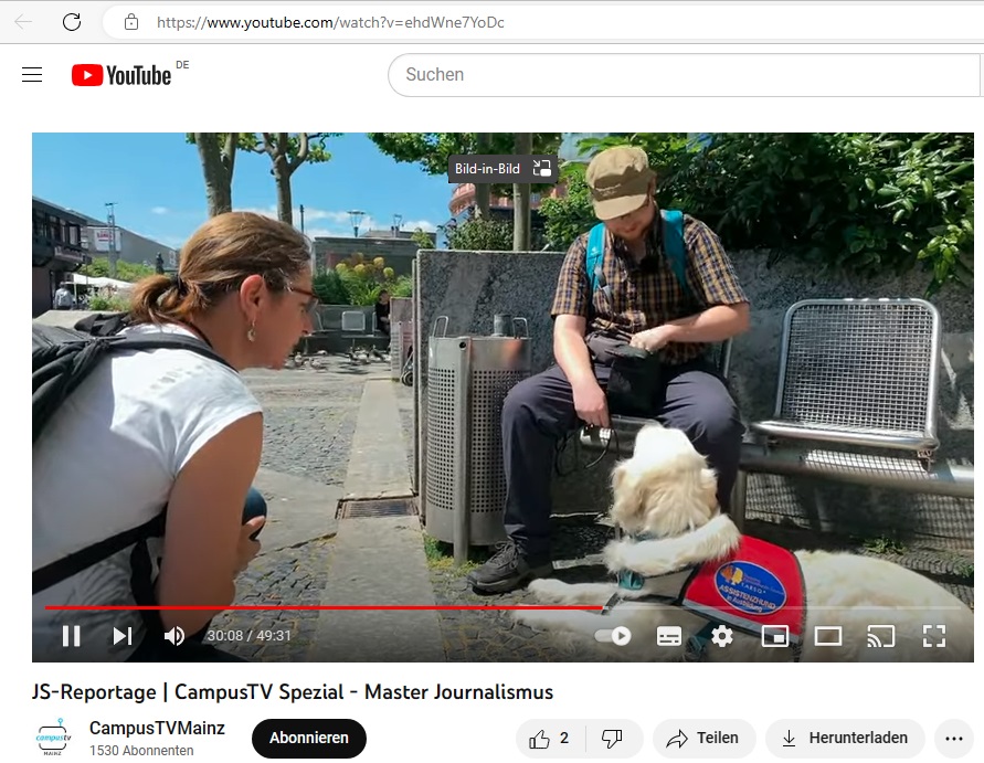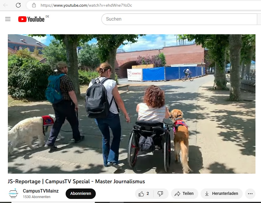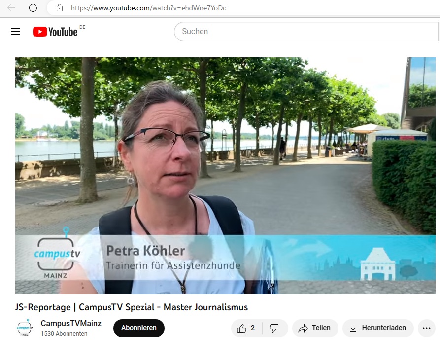Das Campus TV der Johannes Gutenberg-Universität Mainz hat mich bei meiner Arbeit begleitet. Dabei herausgekommen ist eine Reportage über folgende Assistenzhunde: LpF-Assistenzhund, Autismushund und PTBS-Assistenzhund. |