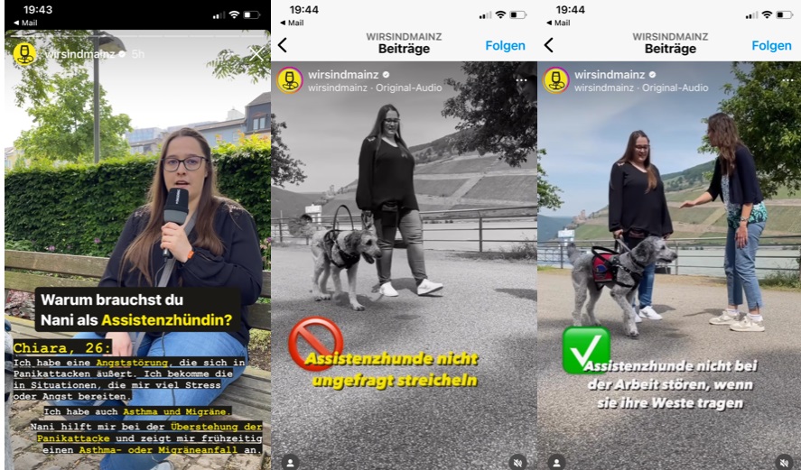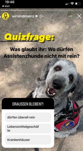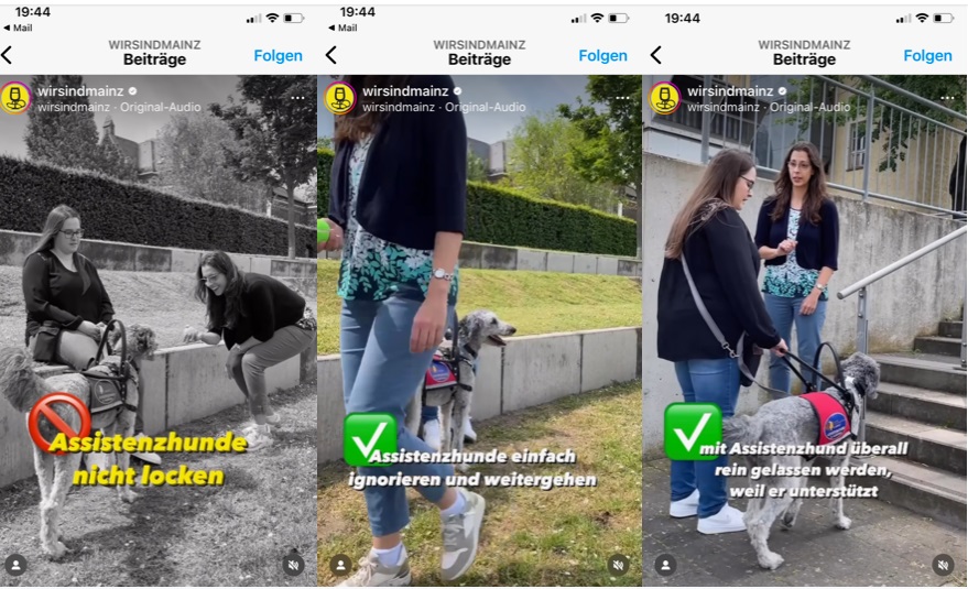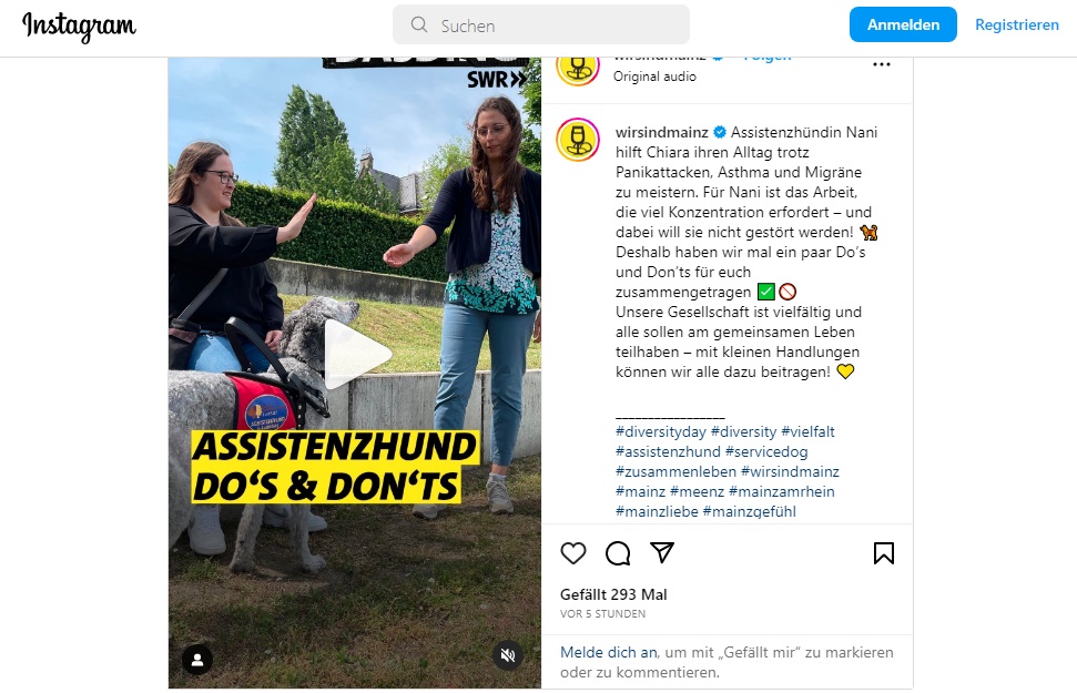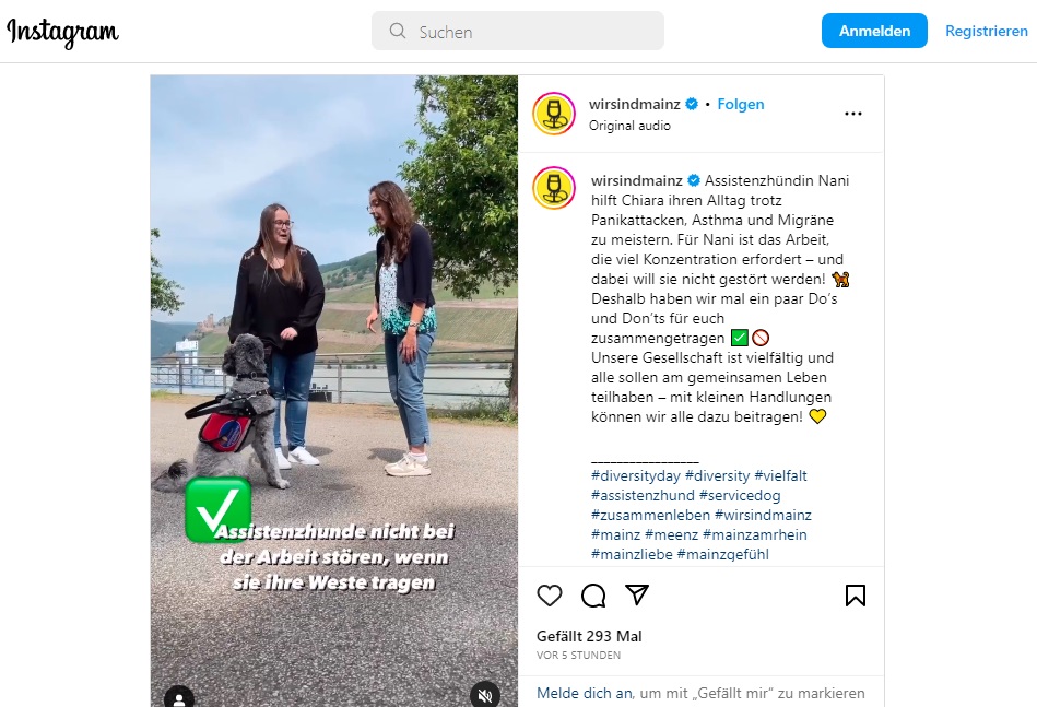 Auf dem Instagram-Kanal "WirsindMainz" zeigen mein Team Chiara und Nani in einem Video, wie man richtig damit umgeht, wenn man einen Assistenzhund bei der Arbeit sieht. |