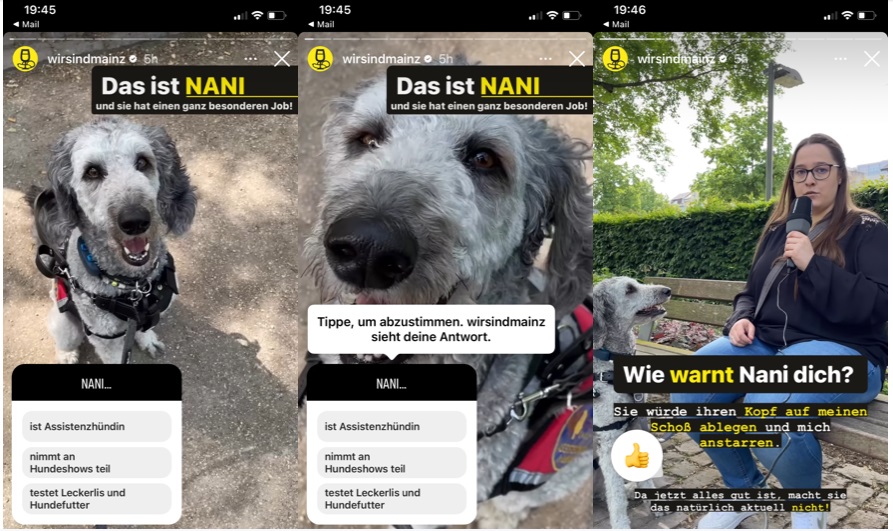 In der Instagram Story von "WirsindMainz" klärt Chiara mit ihrem angehenden Assistenzhund Nani auf, wie die Öffentlichkeit am besten reagiert, wenn sie auf einen Assistenzhund trifft. |