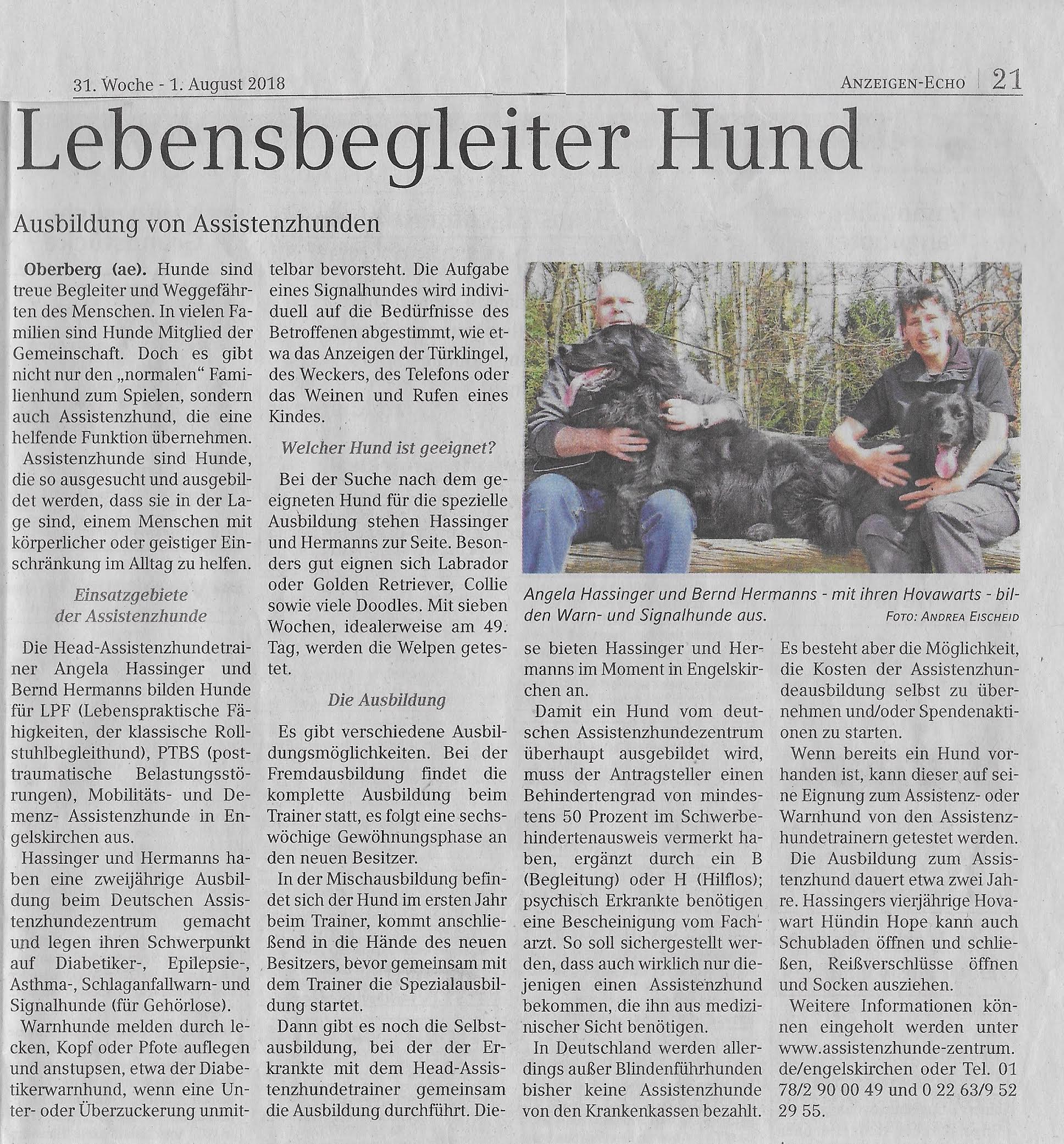 Rheinische Anzeigenblatt berichtet über Lebensbegleiter auf vier Pfoten Ausbildung von Assistenzhunden Artikel